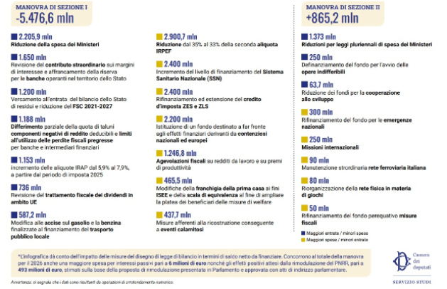 La manovra di bilancio 2026, illustrata in un’infografica della Camera, prevede entrate complessive per 760,7 miliardi di euro e spese finali per 915,6 miliardi, con un intervento di riequilibrio che punta a sostenere redditi, sanità e crescita, mantenendo il controllo della spesa pubblica. Tra le misure principali, spicca la riduzione della seconda aliquota Irpef dal 35% al 33%, per un costo stimato di 2,9 miliardi, accompagnata da 1,2 miliardi di agevolazioni fiscali sui redditi da lavoro e sui premi di produttività.