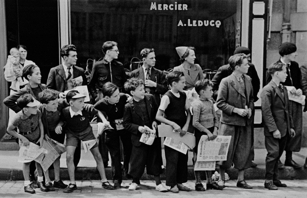 NELLA FOTO. A crowd gathered in front of Mr. Pierre Cloarec's bicycle shop, who is racing in the Tour de France. Pleybon, France, 1939 © Robert Capa © International Center of Photography / Magnum Photos