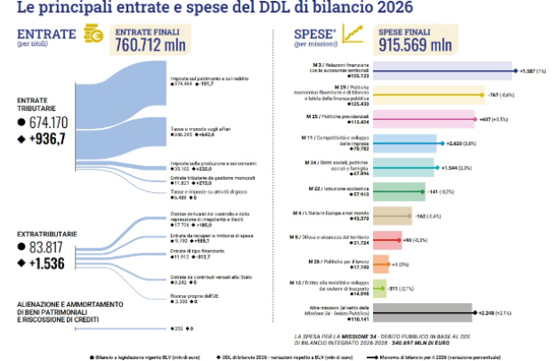 La manovra di bilancio 2026, illustrata in un’infografica della Camera, prevede entrate complessive per 760,7 miliardi di euro e spese finali per 915,6 miliardi, con un intervento di riequilibrio che punta a sostenere redditi, sanità e crescita, mantenendo il controllo della spesa pubblica. Tra le misure principali, spicca la riduzione della seconda aliquota Irpef dal 35% al 33%, per un costo stimato di 2,9 miliardi, accompagnata da 1,2 miliardi di agevolazioni fiscali sui redditi da lavoro e sui premi di produttività.